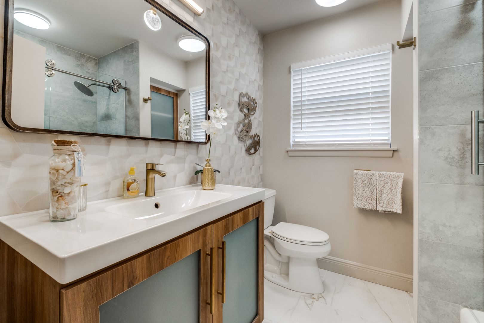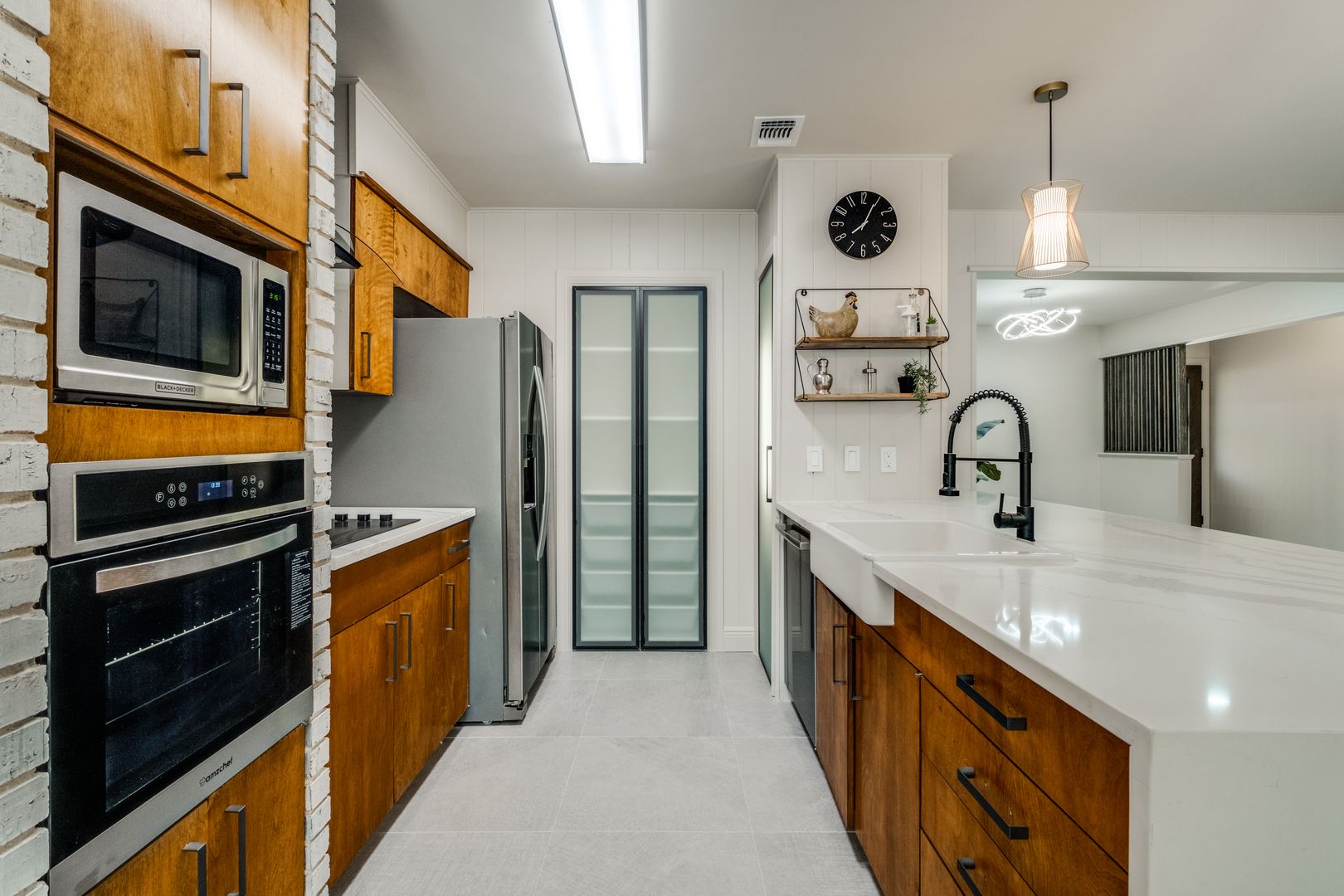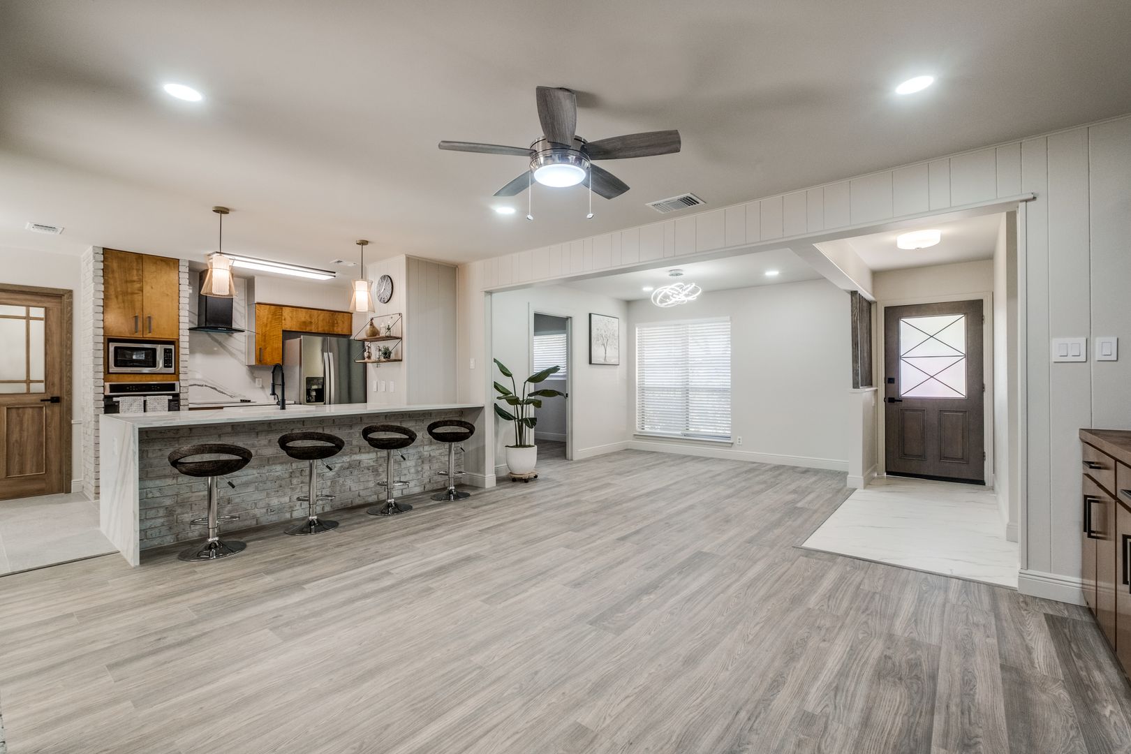 The kitchen and bathrooms truly shine, featuring stylish finishes and thoughtful design. The kitchen boasts quartz countertops with a sleek waterfall edge and an extended island, perfect for entertaining guests or enjoying family meals.