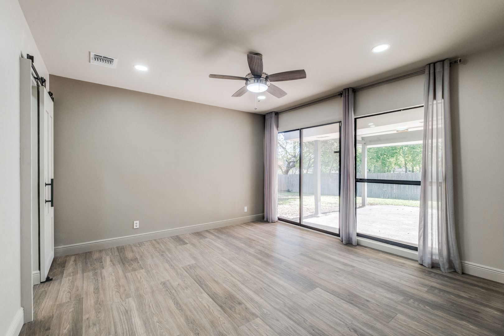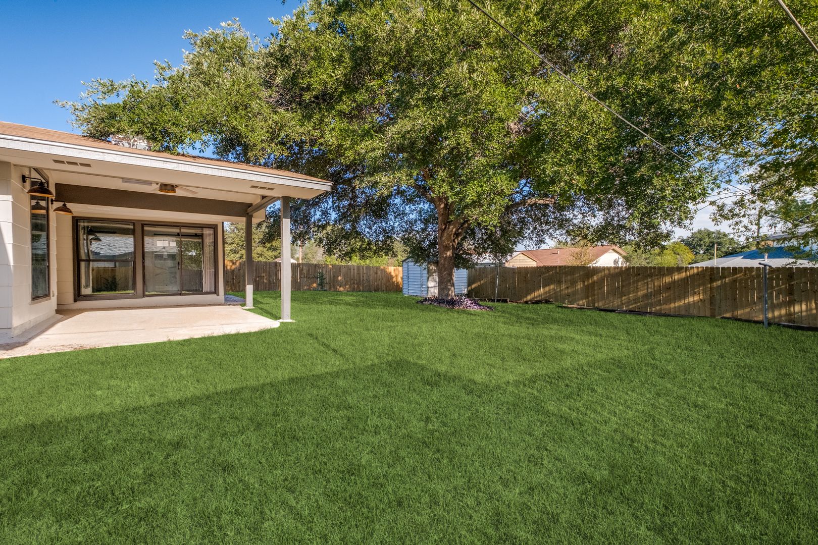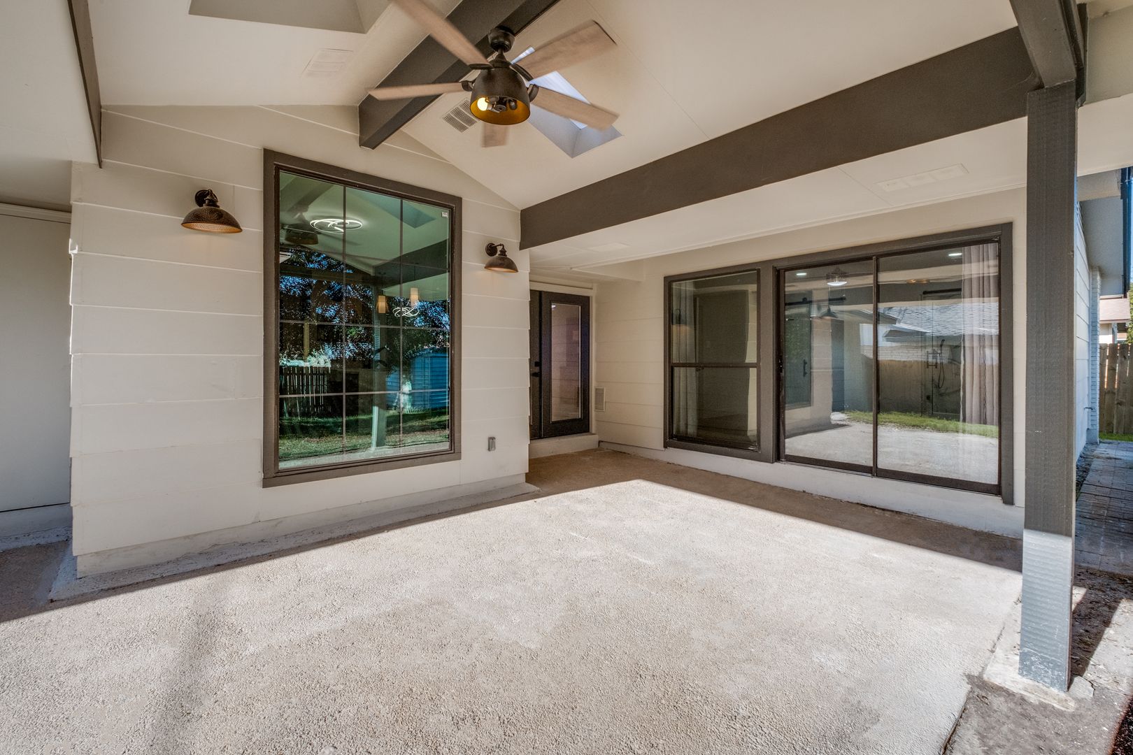 Custom light fixtures and ceiling fans throughout the home add a touch of modern sophistication. Step outside onto the spacious patio, where you can relax and unwind in your own private outdoor retreat.
